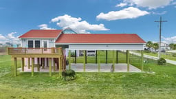 Double RV port on the beach side of Highway 87 featuring covered space for two travel trailers with 30/50 amp hookups and a spacious living area above. The massive concrete slab provides ample room for two RVs under cover, ideal for hosting family and friends at the coast. This well-maintained property includes an attached garage with abundant storage. The 612 sq ft upstairs living quarters offer an open-concept layout with living area, kitchen and breakfast bar for dining, comfortably configured to sleep up to eight guests. Step outside onto the large upstairs deck overlooking the canal and enjoy beautiful water views, coastal breezes and a perfect space for relaxing or outdoor entertaining. Being sold fully furnished, this turnkey property makes an excellent vacation getaway, fishing retreat or investment opportunity.